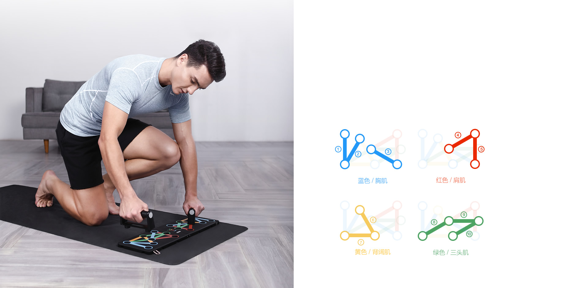 云麦俯卧撑支架符合人体工程学设计,能够强化局部肌肉力量,纠正运动姿势,塑造上肢肌肉曲线。四种颜色标识对应不同部分肌肉,十种训练模式,多重组合变化。让枯燥的锻炼趣味横生,全新蜕变尽在方寸之间。
