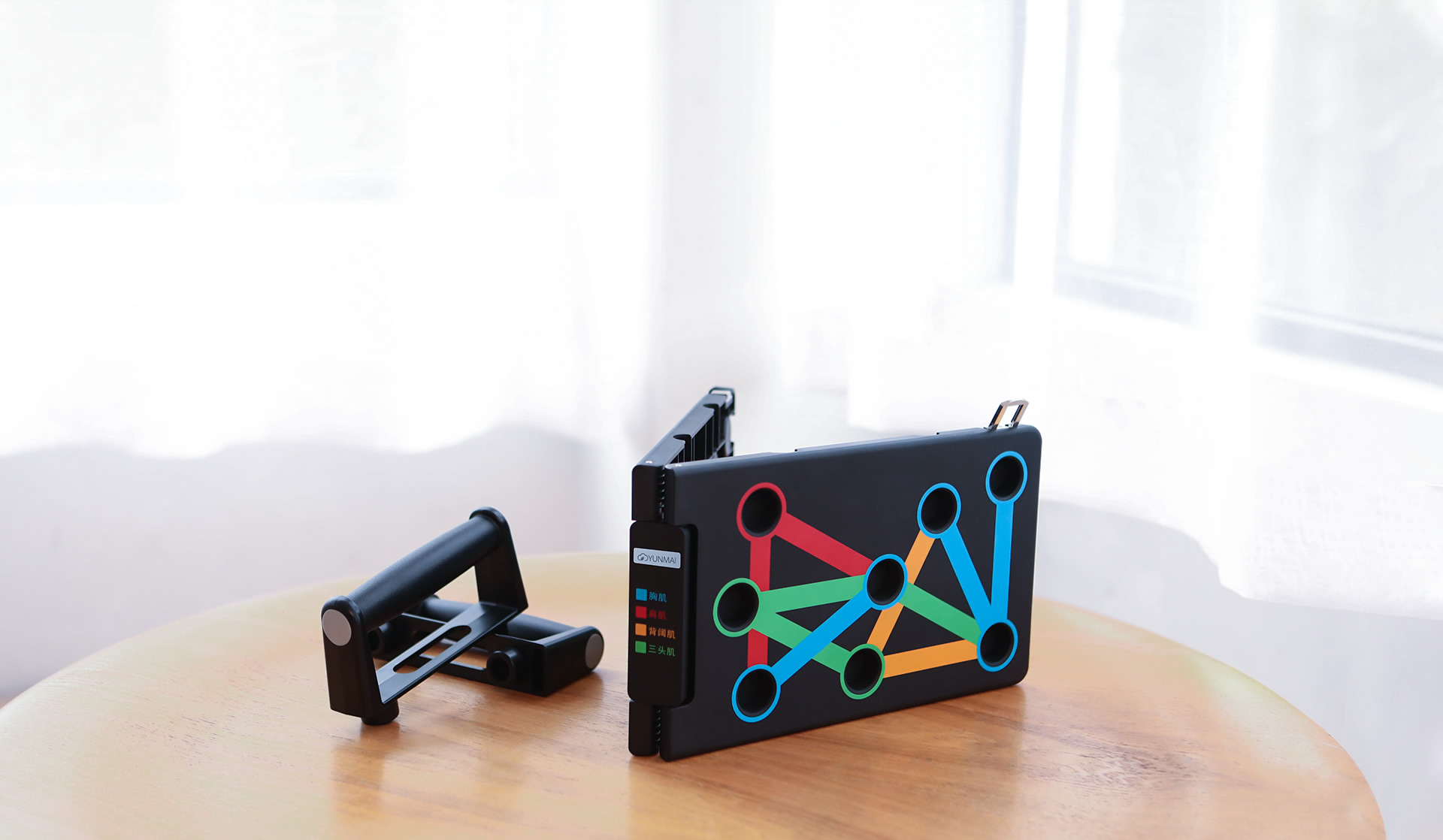 轻量化ABS材质结合专利创新折叠设计,大大降低了支架的收纳面积及整体重量;俯卧撑折叠支架板搭配可拆卸把手,便于携带和训练,只要有平整的地面,展开支架就能开始锻炼。使用完毕后将其折叠上锁,支架即刻摇身变为小巧的手提箱,可随意收纳在家中任意角落。