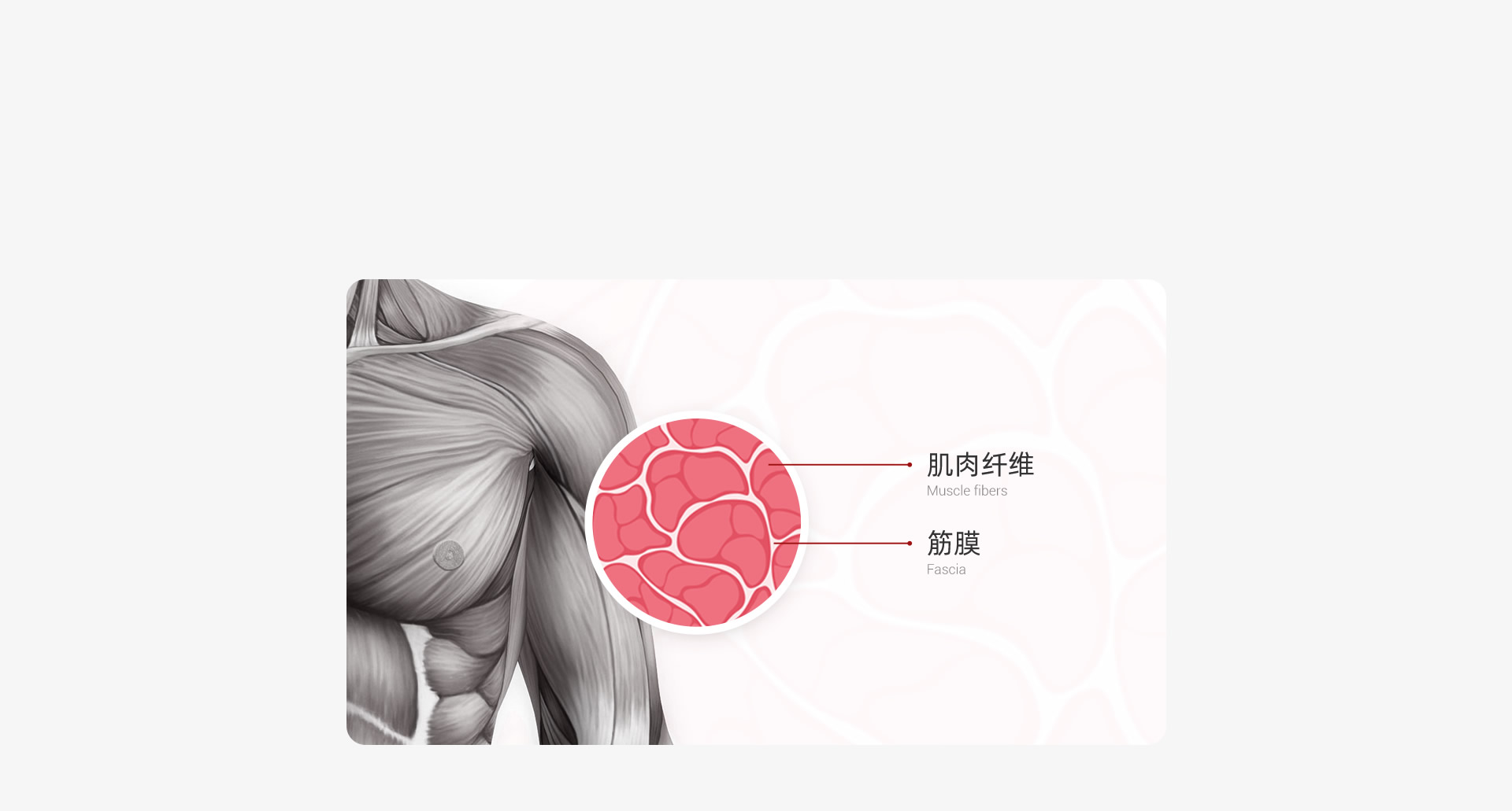 筋膜是包裹肌肉、串联骨骼及内脏的重要组织,运动或不良姿势均会造成筋膜及肌肉断裂损伤,产生粘连结节,出现“肌肉延迟性酸痛”,导致肌肉僵硬疼痛。筋膜枪通过高频振动刺激,可以减少肌肉与筋膜之间的粘连与结节,防止运动损伤。