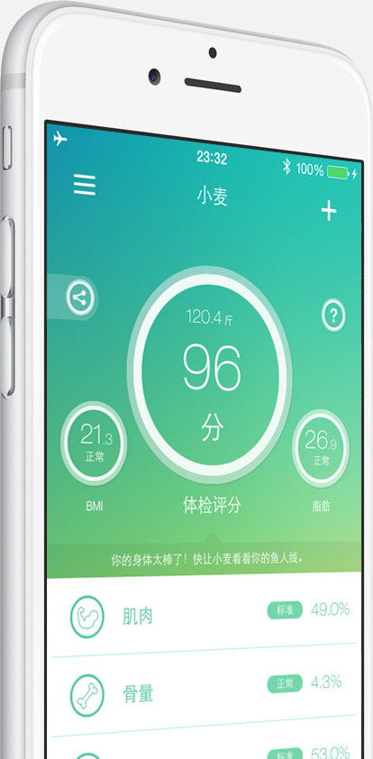 评分是指根据称重所检测数据,结合YUNMAI云端百万人群数据样本,综合评估所得出的 0 - 100 的评分系统,来通过打分直观展示给用户身体当前身体状况。