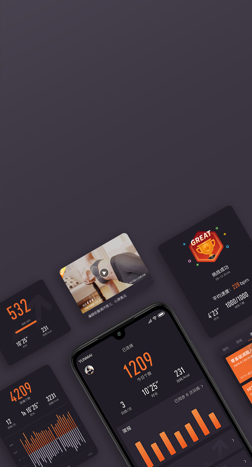YUNMAI智能跳绳可连接微信小程序使用,除了设定目标次数时间,记录数据、计算卡路里外,还有丰富多样的视频指导课程,让运动更加趣味横生。当完成目标后,握杆将以振动提醒您训练结束,并生成运动简报,如同专业教练陪同你一同锻炼,见证你的每一次进步。