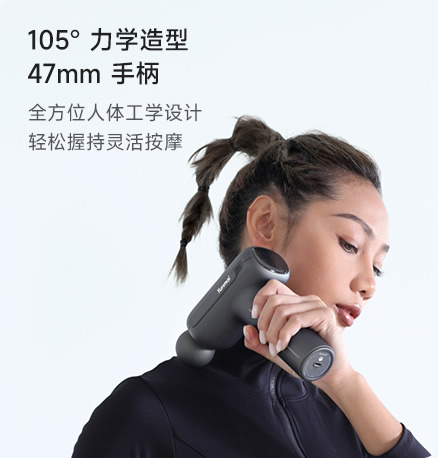 身材虽小,却大有身手,105° 回旋镖力学造型,可灵活触及身体各个部位,并更好地垂直向肌肉施力,从此实现自主放松,按摩后背再不求人,600g 轻量小身材*,纤细人体工学手柄,更适合亚洲人手部尺寸,久持放松不累手,握持更舒适省力。