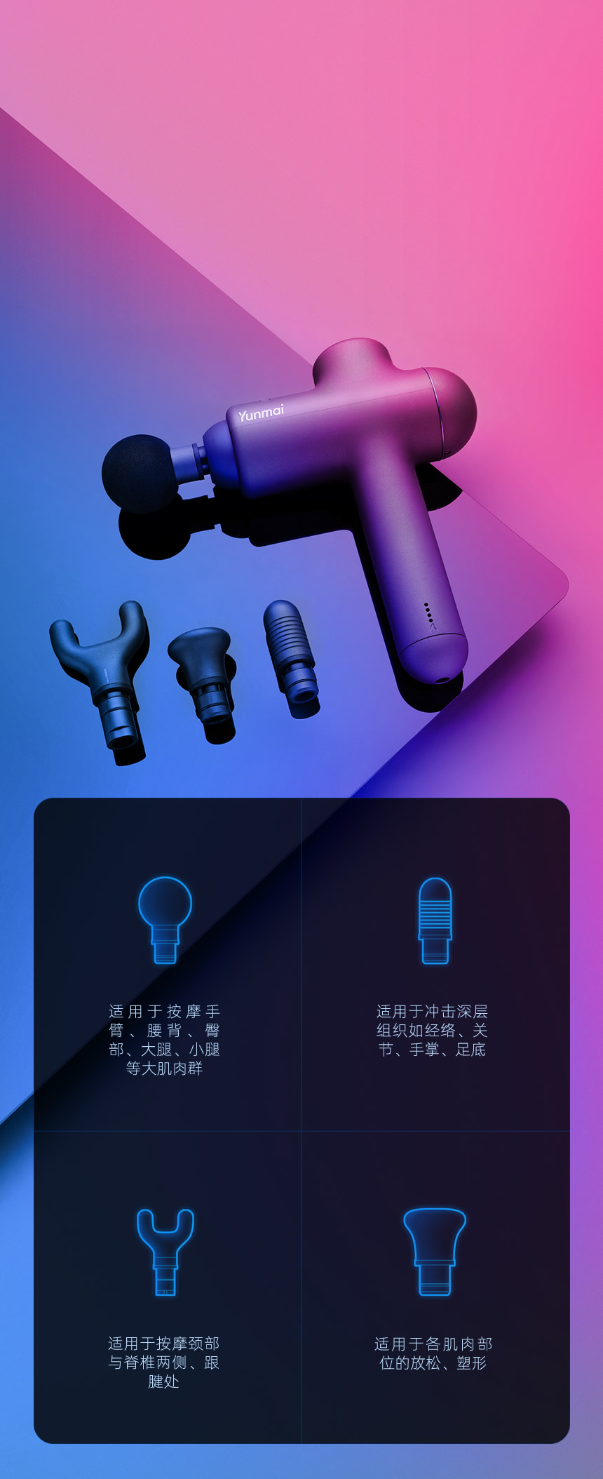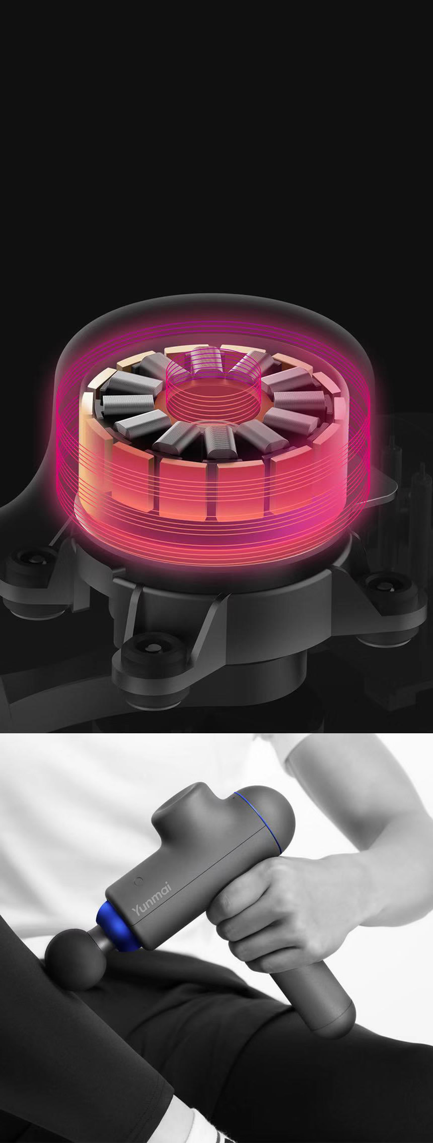 YUNMAI按摩筋膜枪使用24V大功率无刷电机,搭配双轴承转动结构,带来强劲澎湃的动力;3200转/分钟高转速冲击,能穿透10mm深层肌群,迅速击溃运动后产生的乳酸,赋予你直击肉体深处的舒适体验。