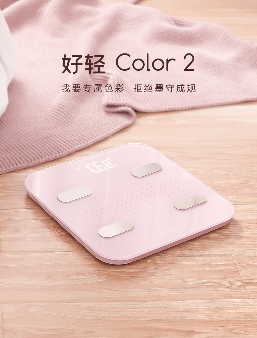 冰淇凌清爽的炫彩,让 Color 2 体脂秤拥有靠脸吃饭的颜值,四款柔和配色:春暖樱花粉,炎夏水绿蓝,晚秋象牙白,冬日天空蓝。既能满足你的少女心,也能成就你的小叛逆。